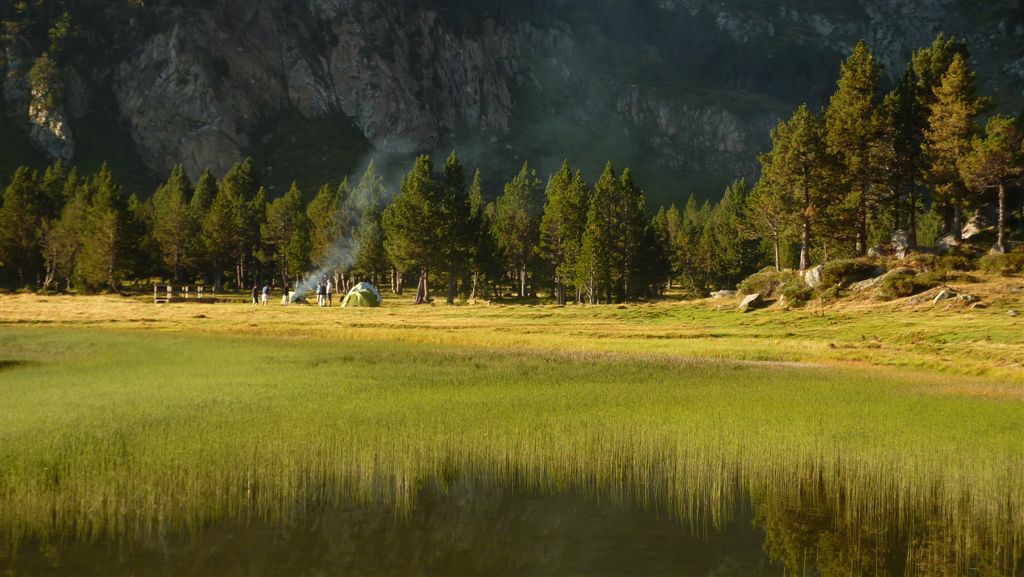 L’étang de Laurenti est un magnifique lieu de campement, tapis de verdure arboré, et de baignade pour ceux qui le souhaitent, quoique l’eau soit un peu fraîche. Un bon feu de camp revigorera les baigneurs intrépides avant que ne coule à flots pastis et vin rouge
