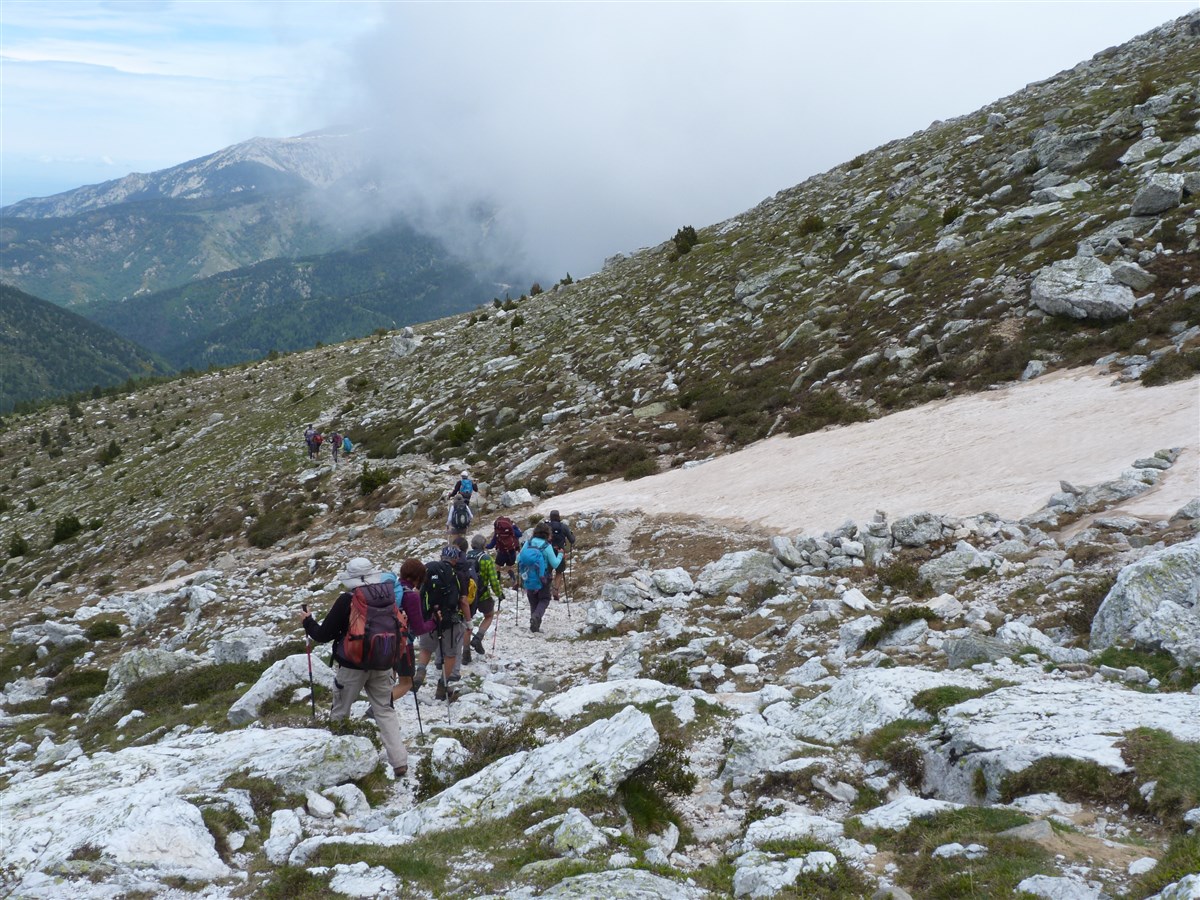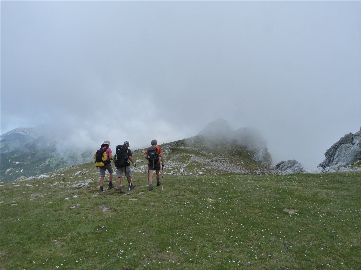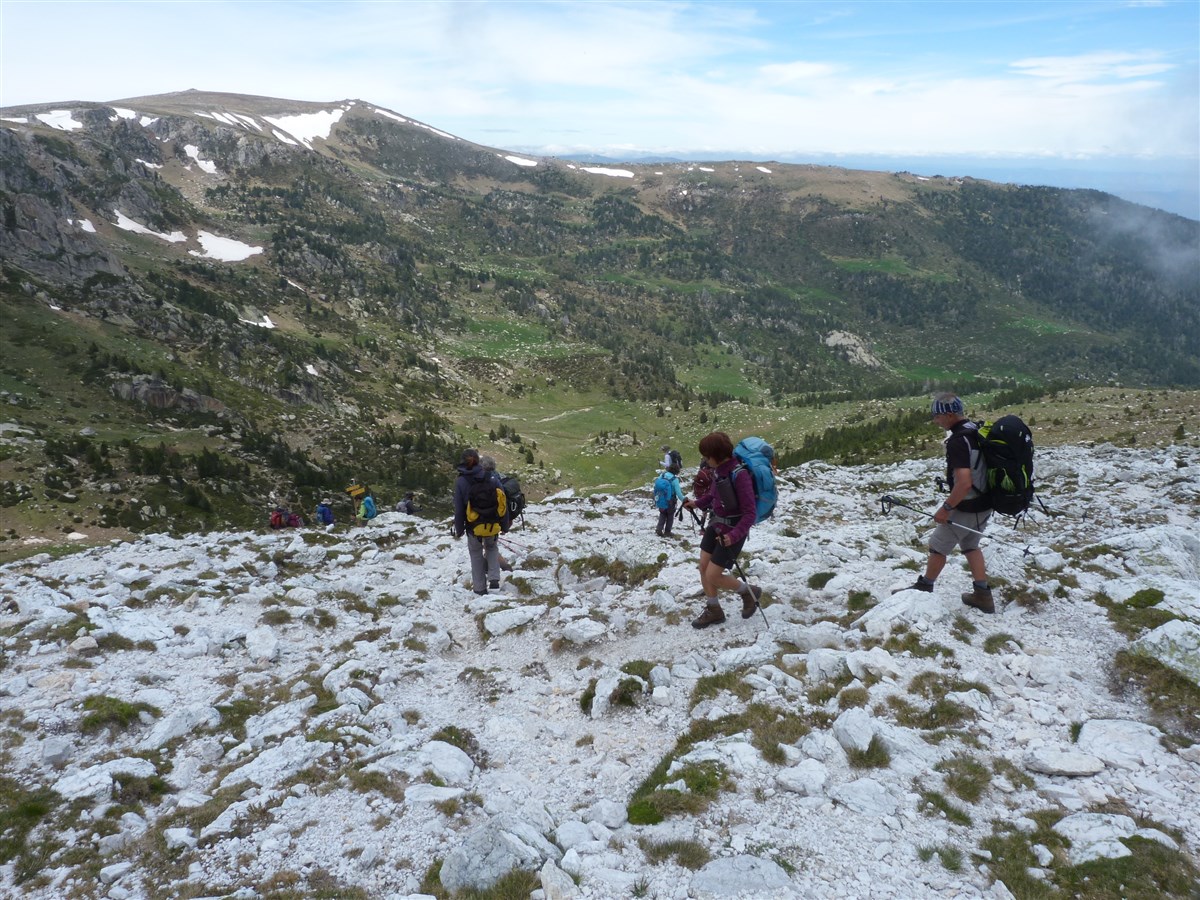 Pour le retour, départ de l’arête depuis laquelle nous longerons la barre rocheuse des Esquerdes de Rotjà avec un panorama magnifique.